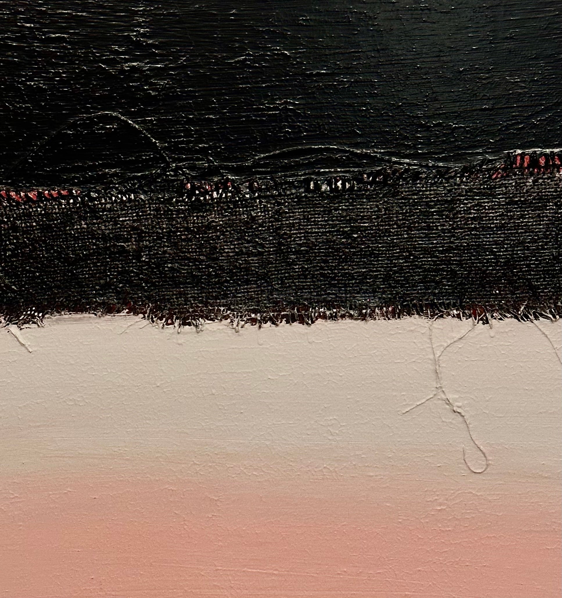 Fragments IV is a one-of-a-kind acrylic painting that explores the dialogue between natural and industrial elements. Deep charcoal tones meet soft earth and muted vintage pinks across the canvas, divided by a rust-tinged jute stripe that adds both texture and visual structure.