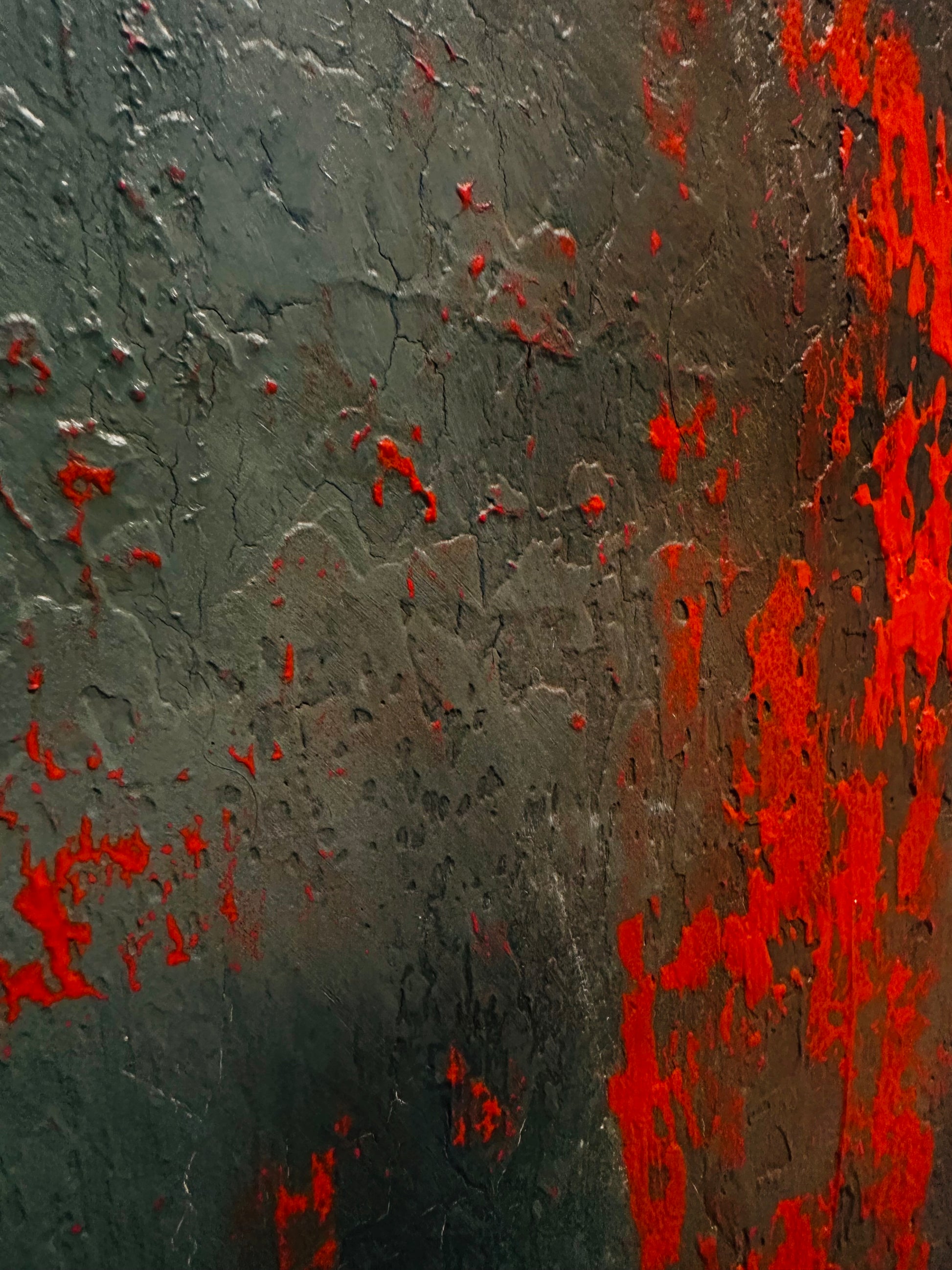 A vertical stripe of molding paste in orange hues slices through each canvas, adding tactile dimension and sculptural interest. The interplay of texture and color evokes natural weathering, the patina of sun-baked surfaces, and the quiet erosion of time.
