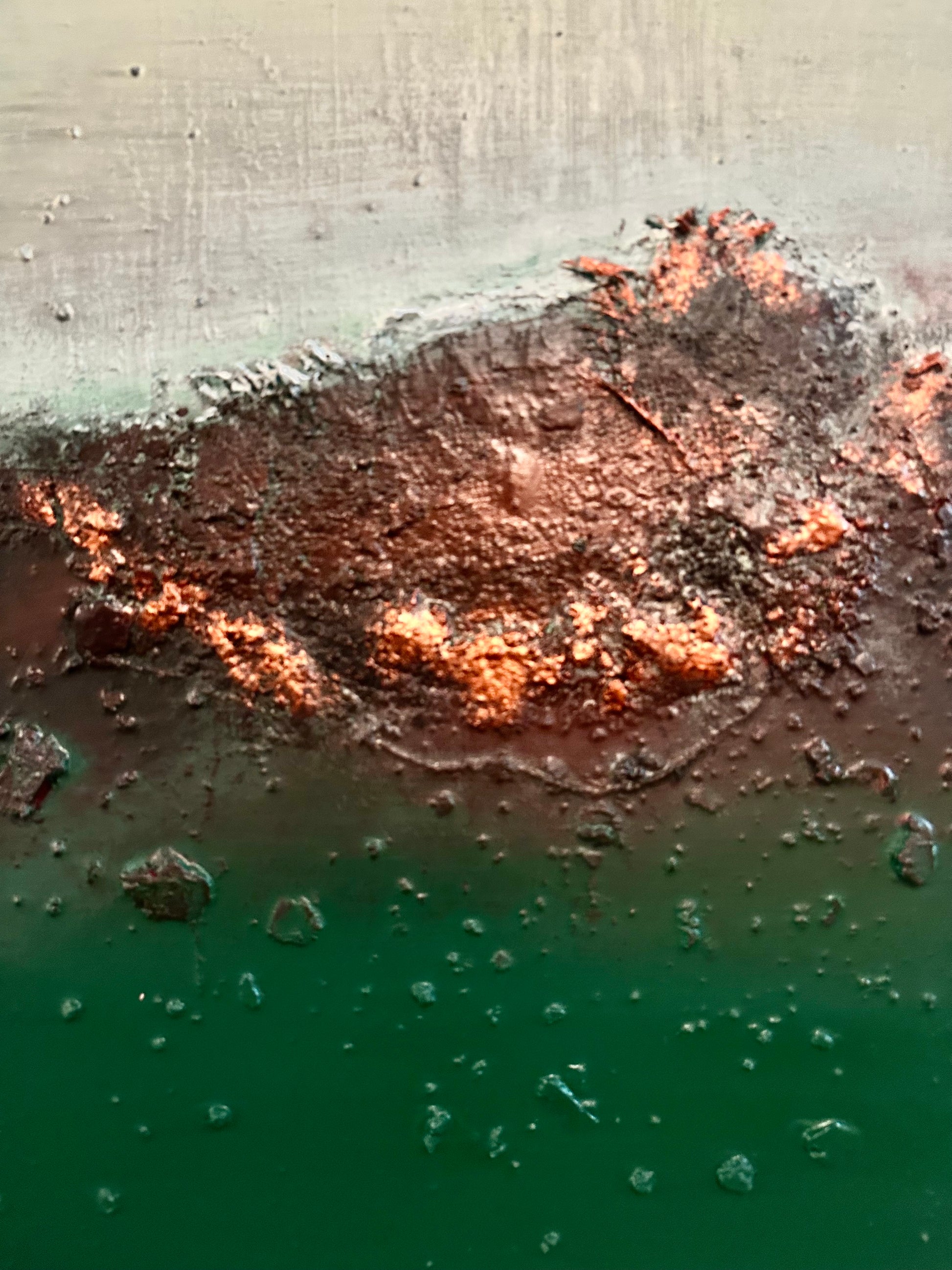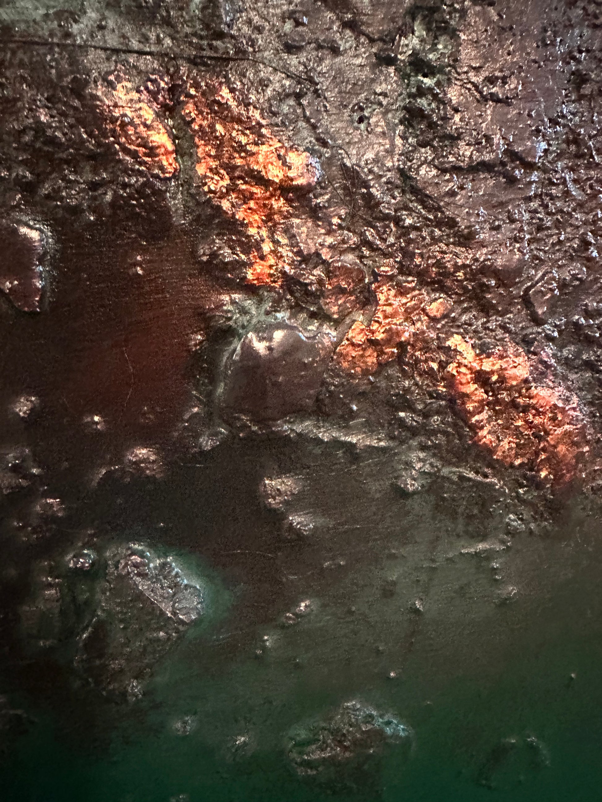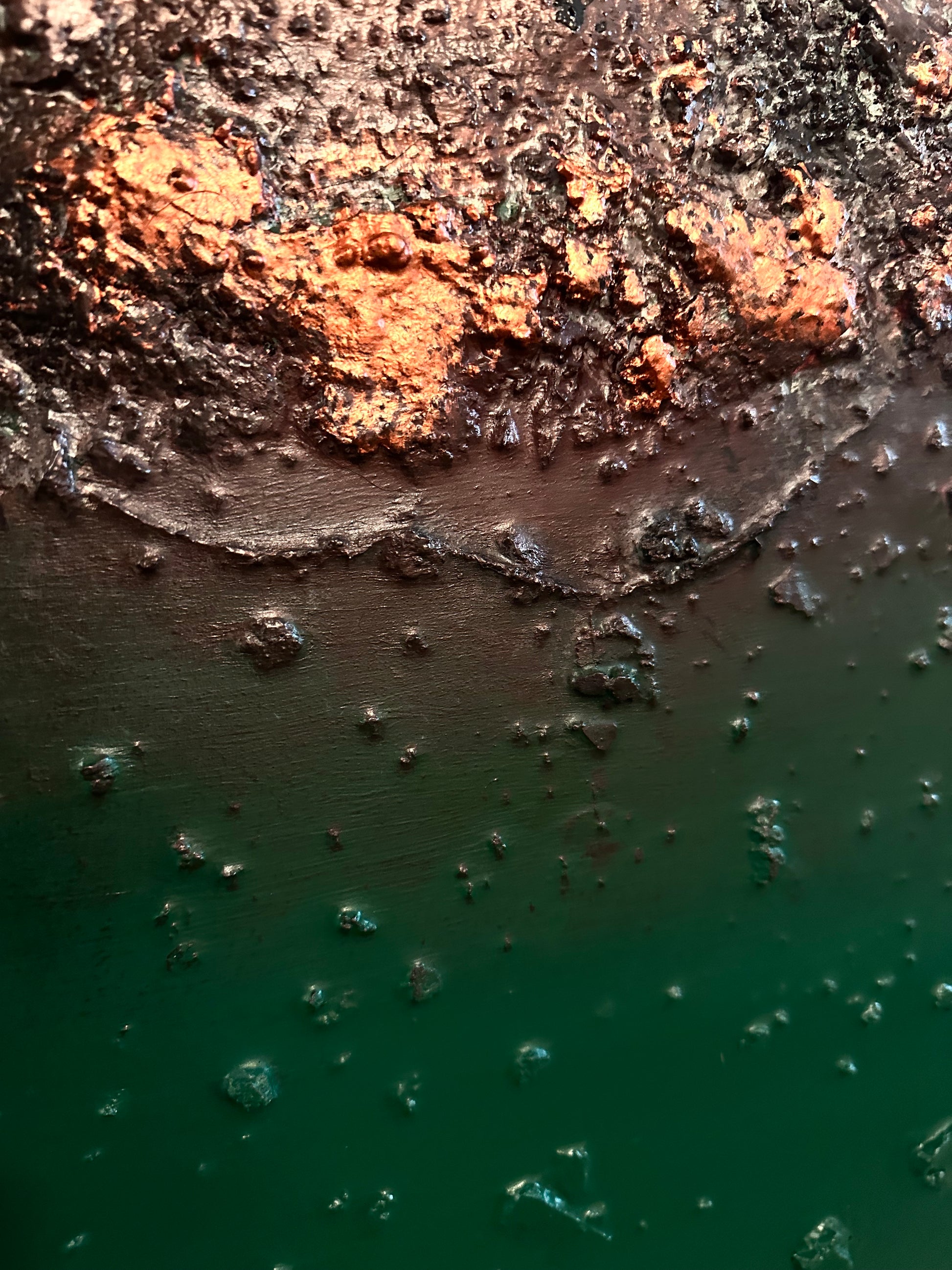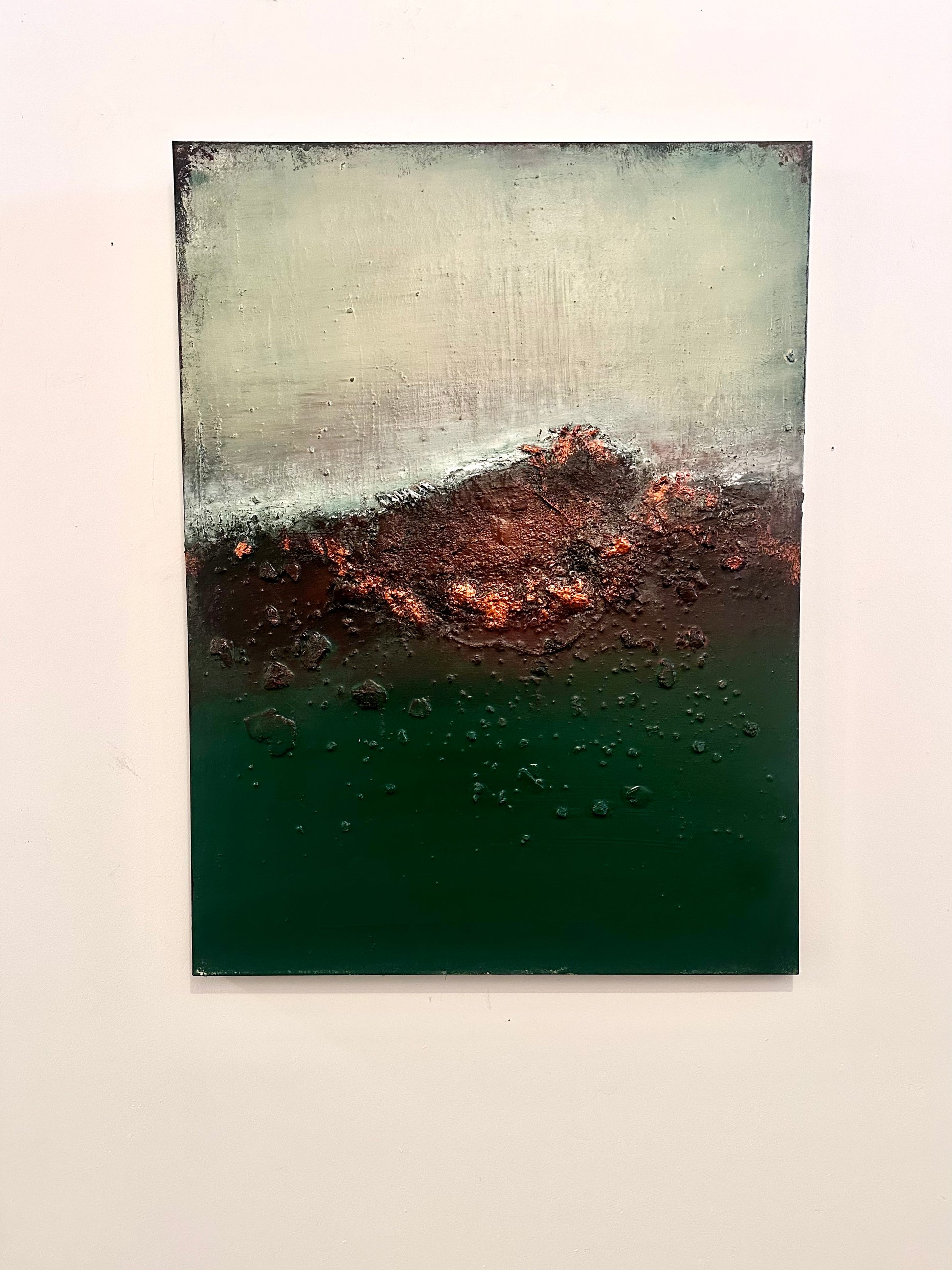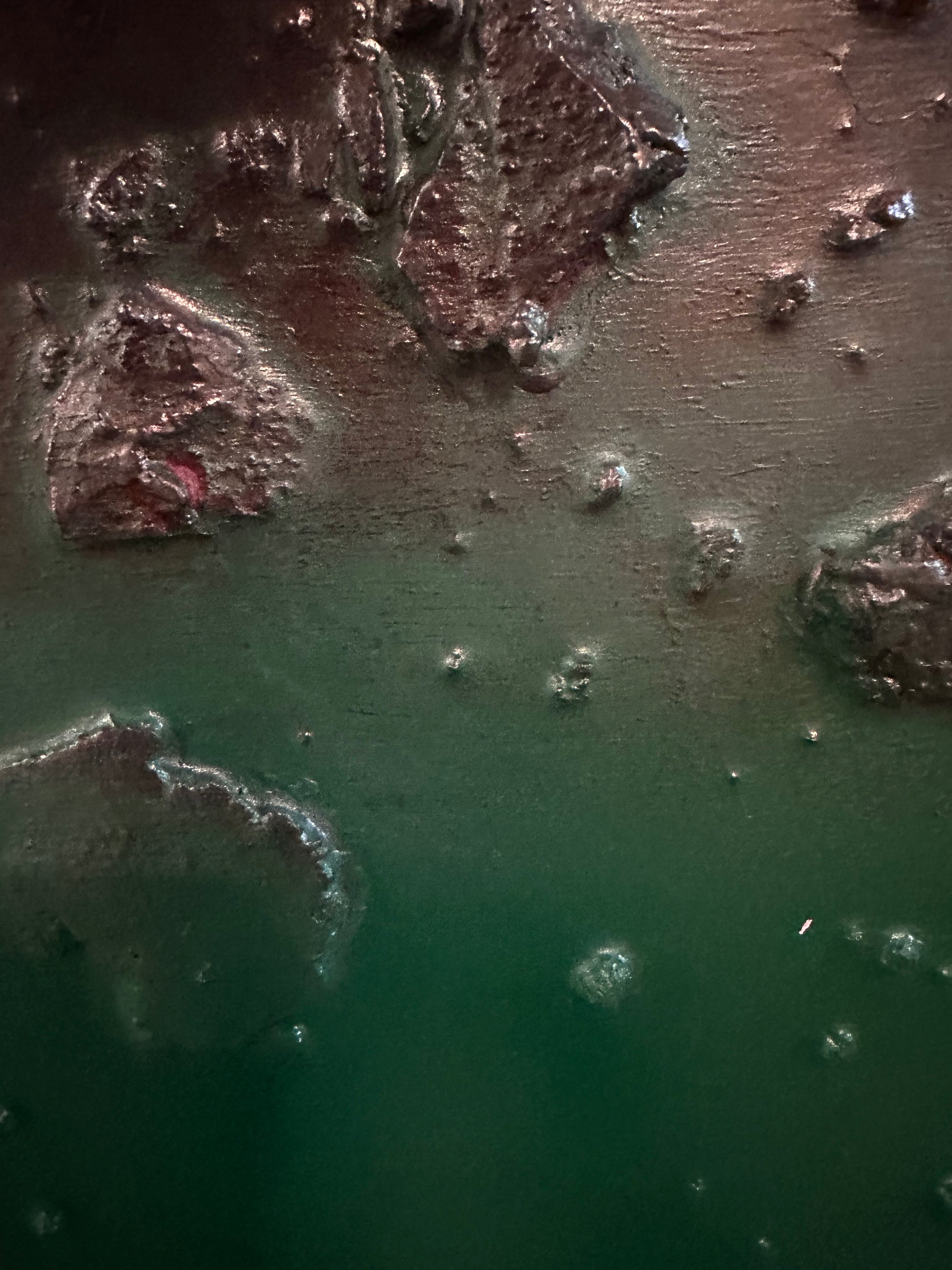 Nature in Motion is a one-of-a-kind acrylic painting that captures the raw energy and quiet rhythm of the earth. Rich green, brown, bronze and earth tones flow across the canvas, interacting with layered textures of sand, rocks, jute, cement, and rust. Suspended in resin, these materials appear frozen in transformation, creating a dynamic balance between movement and stillness.