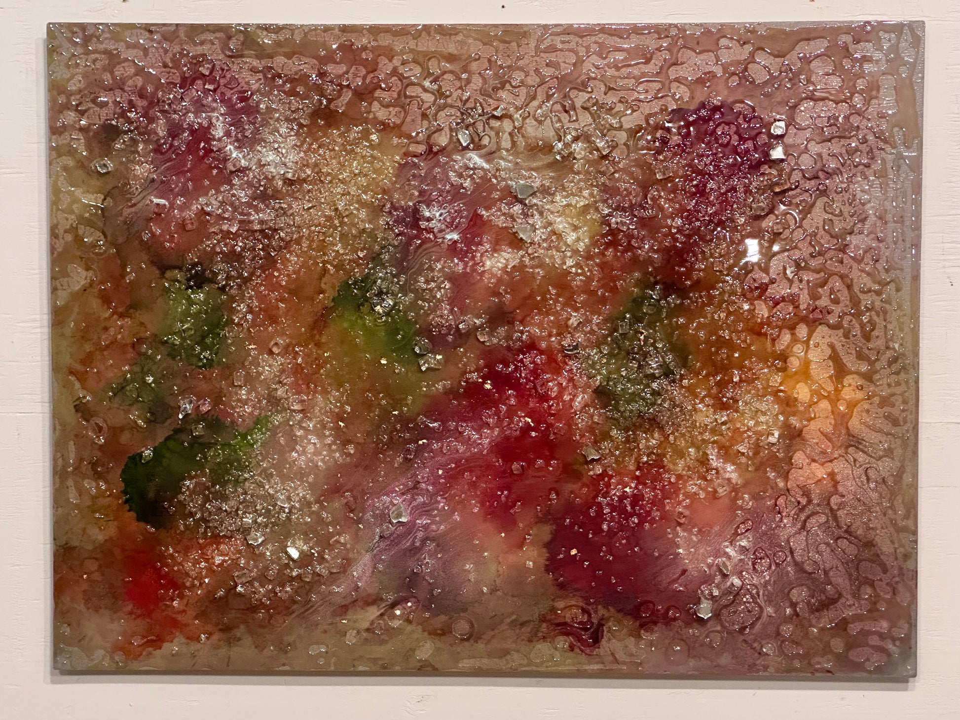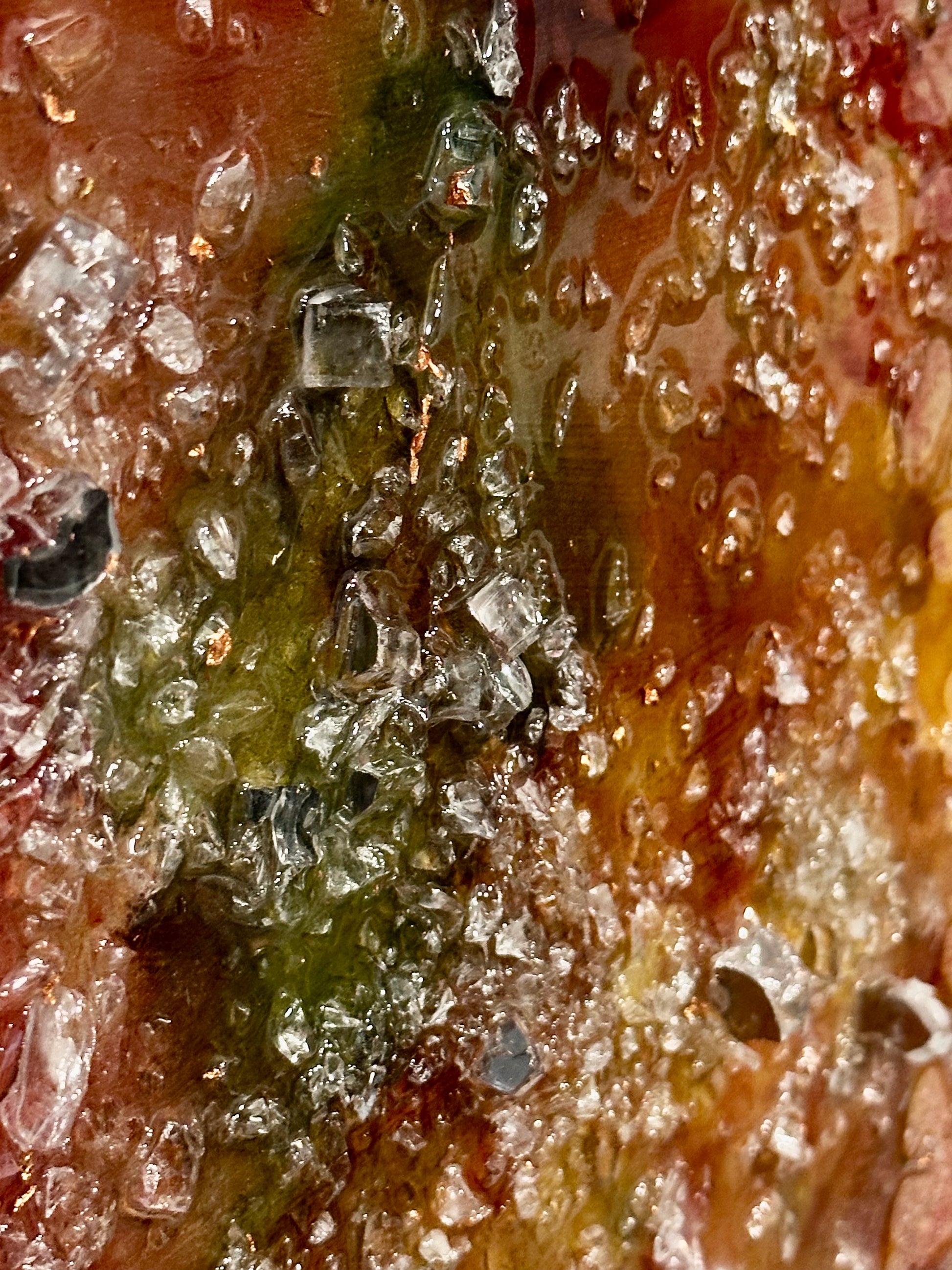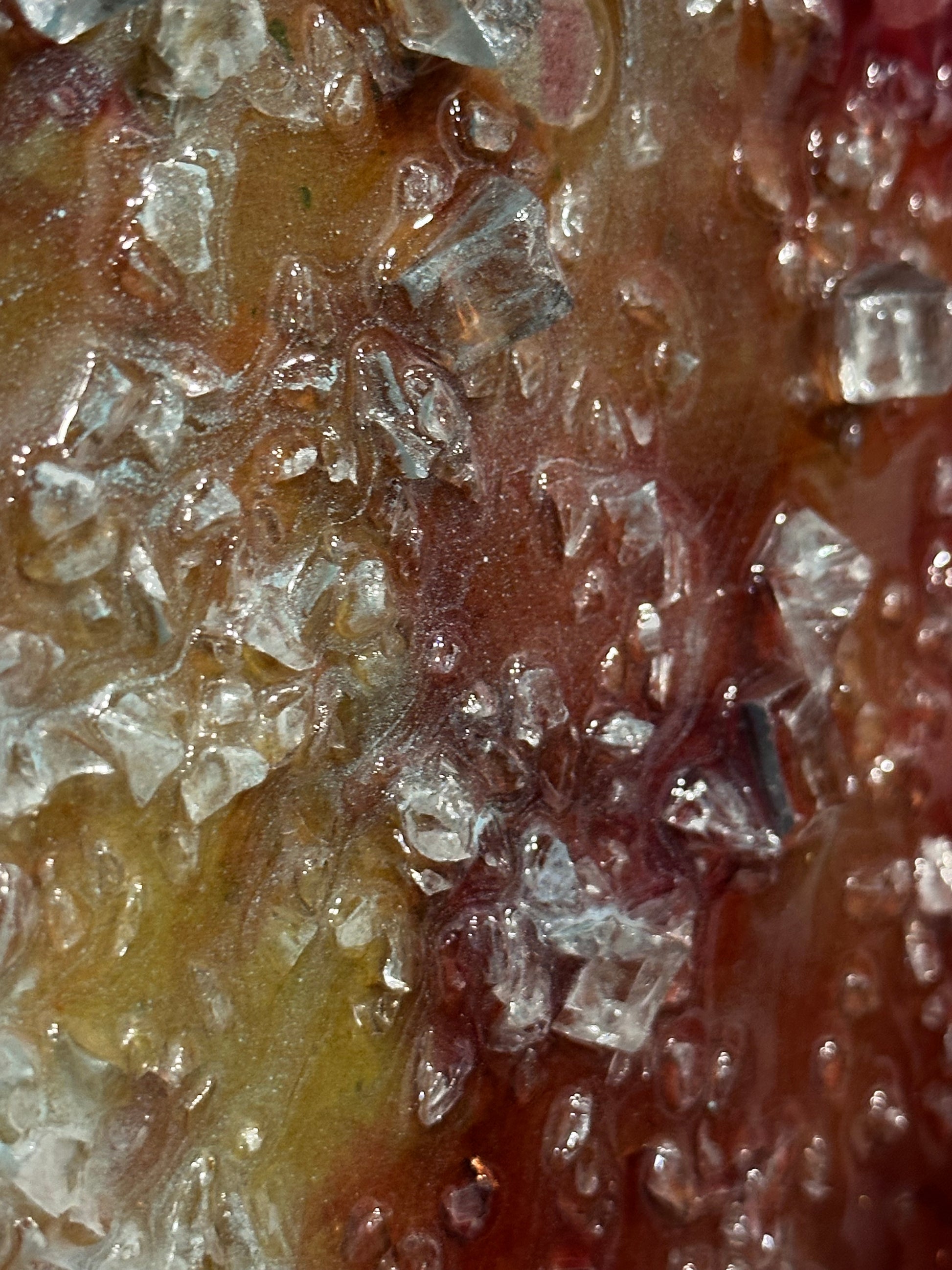 – Layered rainbow pigments with shattered glass and fluid resin