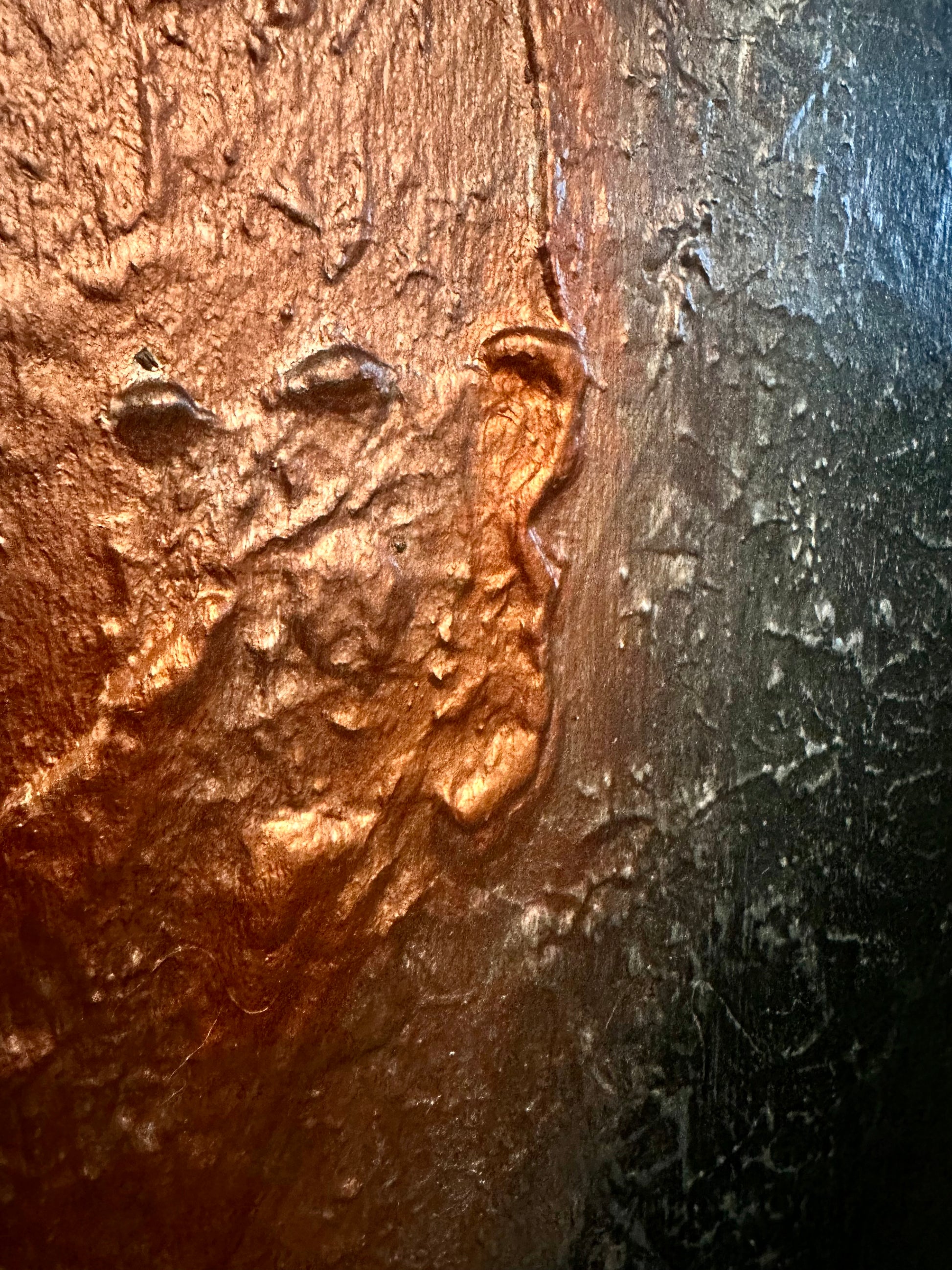 Textured, sculptural surfaces interact with light, emphasizing the raw, physical presence of the piece. Gestural brushwork and depth of materials invite close inspection, allowing the painting to stand alone as a powerful abstract statement.