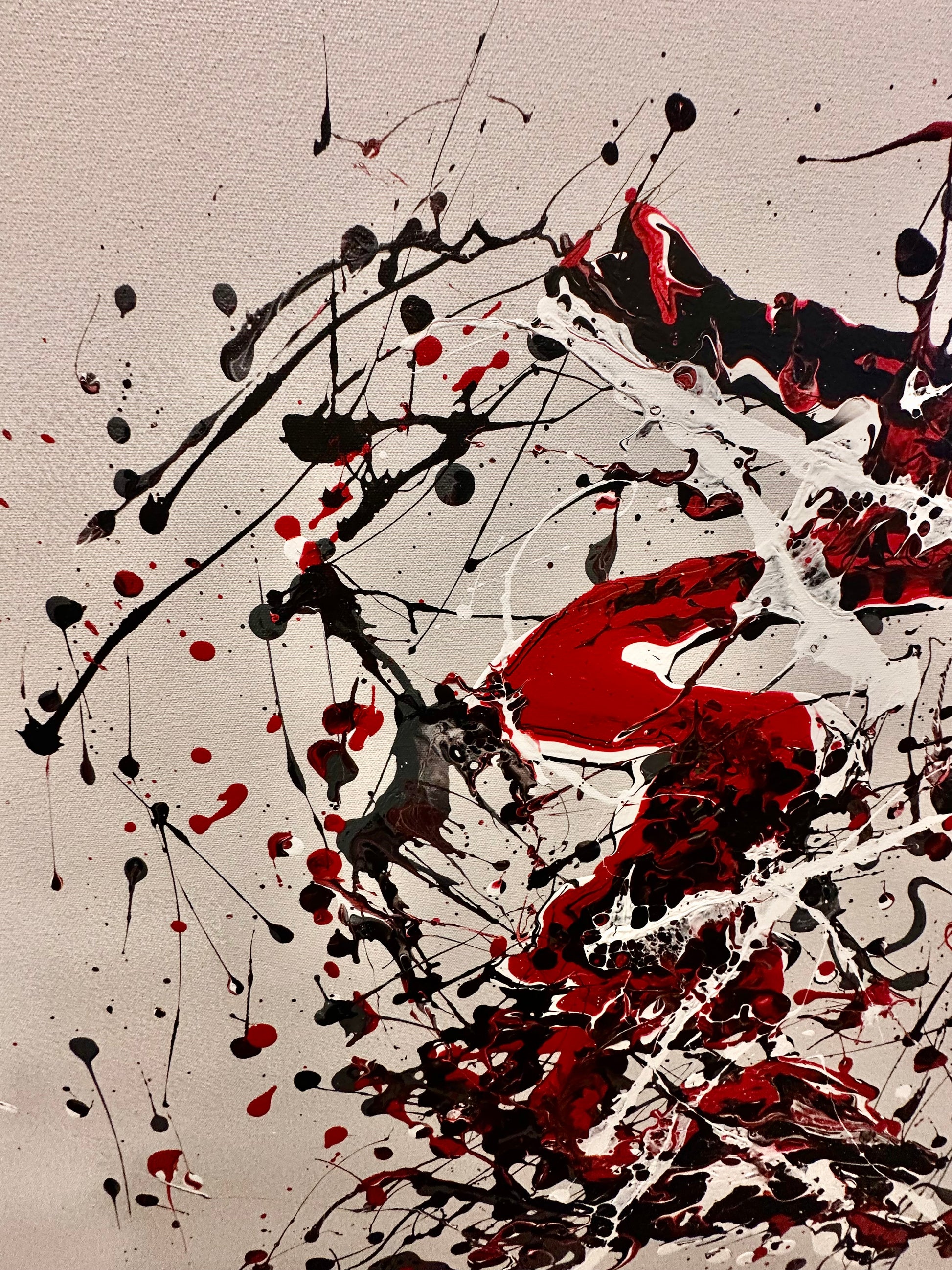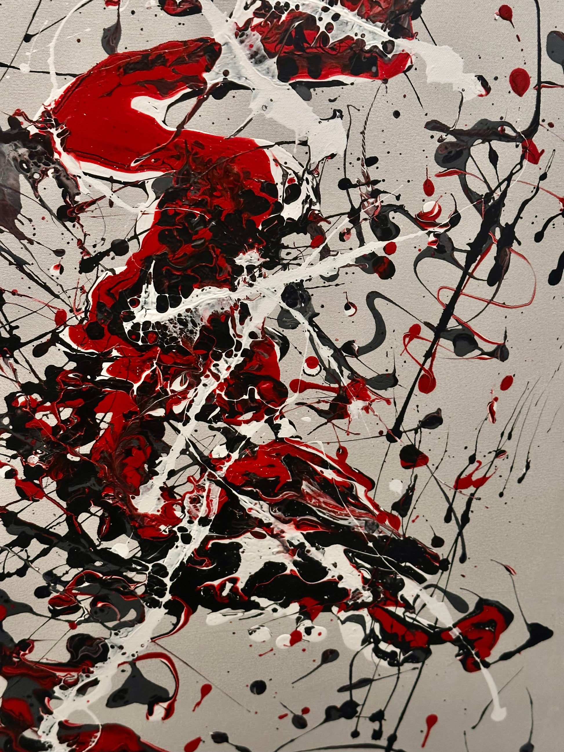 Velocity Echo II pulses with kinetic energy, featuring dynamic brushstrokes and layered textures in red, black, gray and white that ripple like motion frozen in time. A celebration of speed, rhythm, and visual resonance.